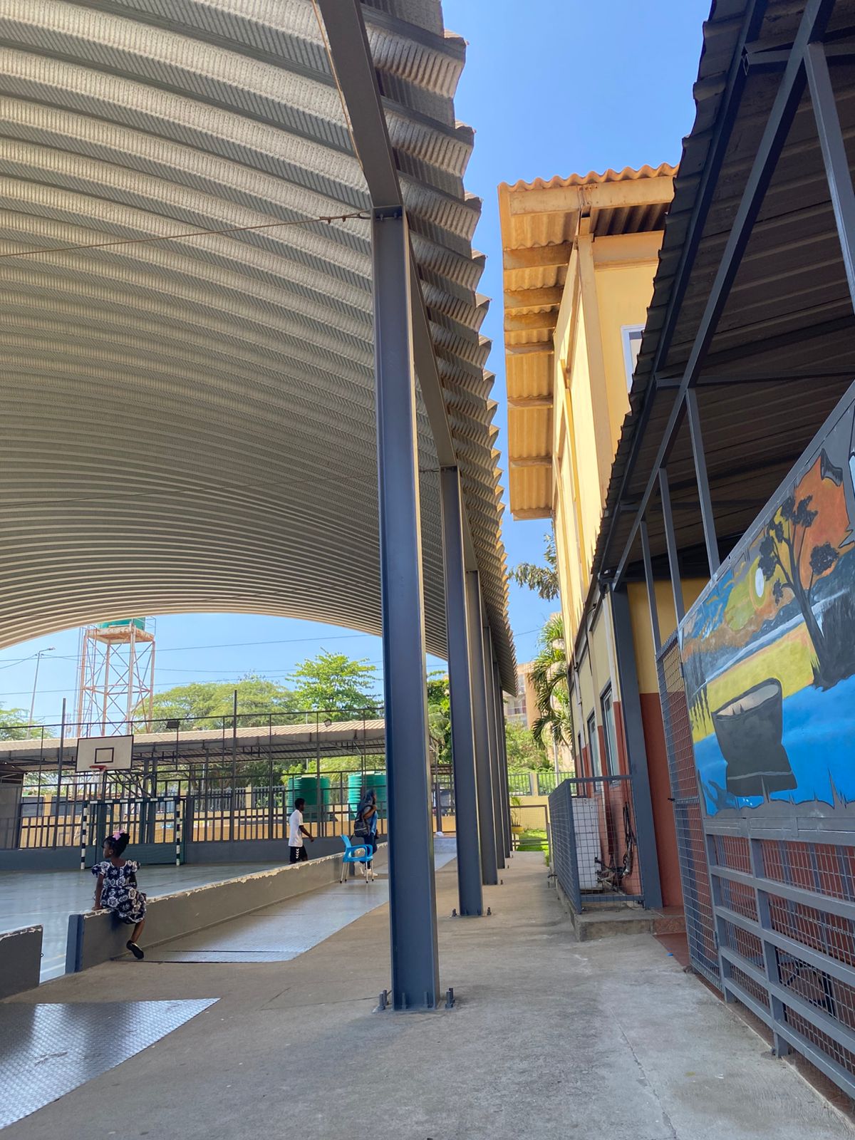 Betão armado, blocos de cimento, vidro temperado, alumínio e madeira